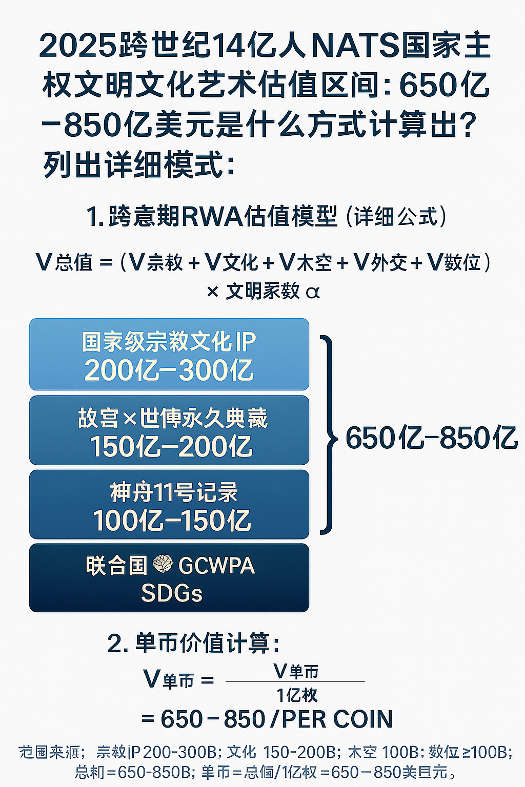 「2025 年 NATS 整體潛在估值區間(650 億–850 億美元)」 的詳細計算方式與模型說明,完整對應您圖卡的概念,但更具體化為可追溯的文明型 RWA(Real World Asset)估值公式與推導邏輯: