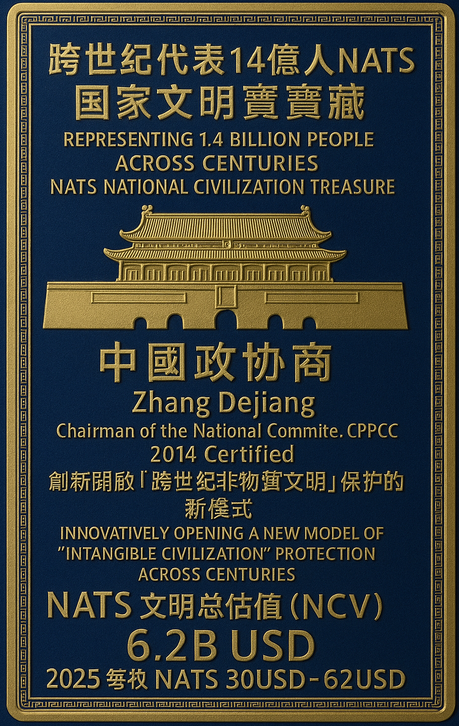 跨世紀代表14億人NATS國家文明寶藏3D立體金唐卡--中國人民政治協商會議全國委員會俞正聲主席2014年4月6日回函內容認證-创新开启「跨世纪非物质文明」保护的新模式 , NATS 文明总估值(NCV)提升至 62 亿 USD, 2025年 NATS 每枚 30USD-62USD