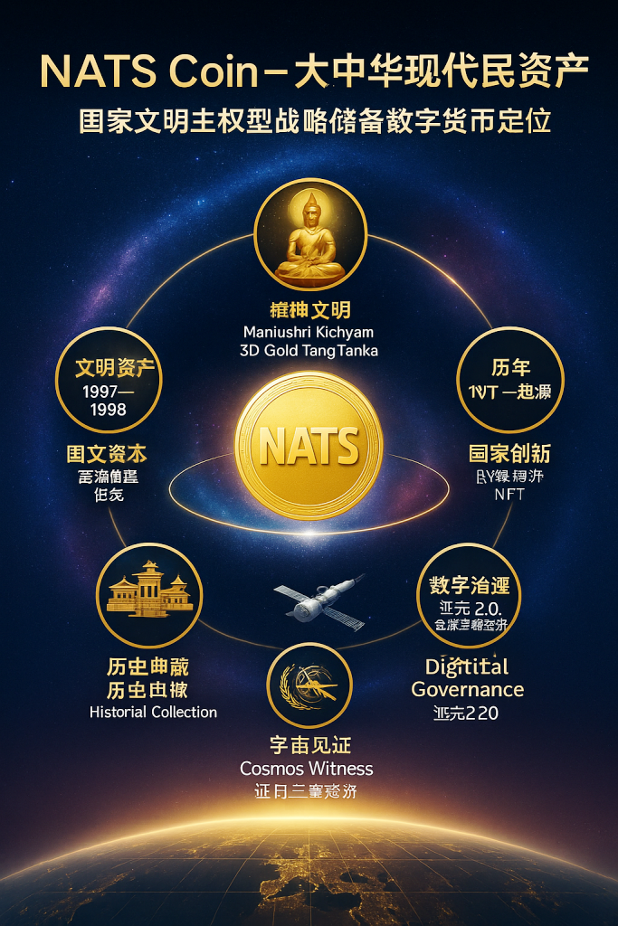 NATS Coin作為跨世紀「大中華現代民族資產」的國家文明主權型戰略儲備數位貨幣,融合大中華百千年「慈愛·智慧·圓滿」國家精神文明與文化正傳承,橫跨次元、星系、歷史、藝術等維度,成為人類跨世紀共同精神文明文化藝術資產新標竿。其六大支柱(精神、文明、國族創新創作、歷史機構、宇宙見證、數位轉型)支撐其作為全球首枚文明共識型儲備貨幣的定位,推動APEC和平共同體與聯合國SDGs永續發展。2030年預估增值2.5-100倍,價格5-200美元;2035年達250-1000倍,價格500-2000美元