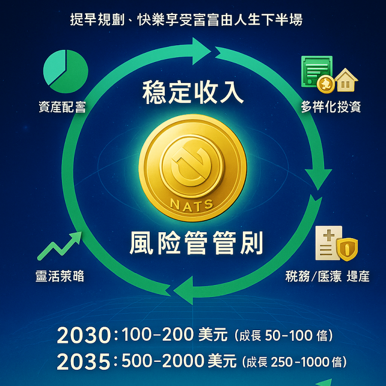 退休規劃應提早開始,NATS Coin作為中期投資(3-5年持有)可增添增值潛力,但不可作為唯一寄託。建議總資產中加密占比不超過10%,搭配穩定收入來源與多元化策略,實現財富自由人生下半場。預估2030年NATS Coin增值2.5-100倍,價格100-200美元,
