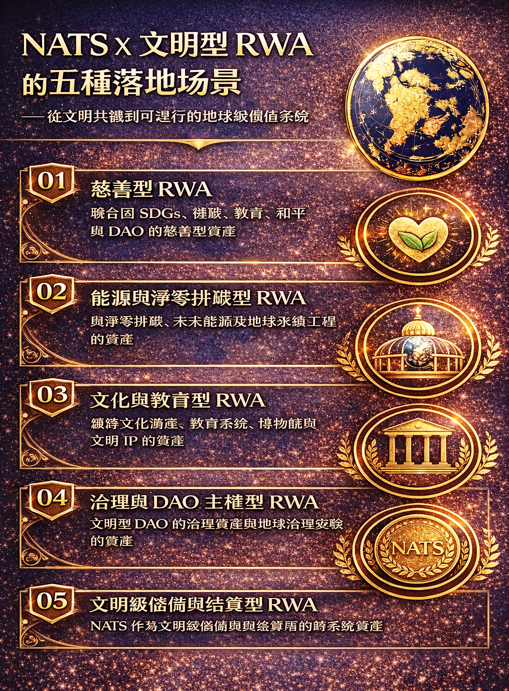 將 文化遺產、教育體系、精神文明成果 轉化為不可複製、不可投機的文明型 RWA,並由 NATS 作為價值錨。