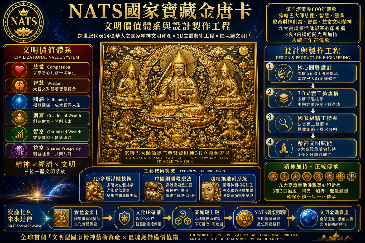 NATS國家寶藏金唐卡(全稱:「宗喀巴大師師徒三尊暨黃財神3D立體金唐卡」)被定位為跨世紀代表14億華人之國家級精神文明資產,其核心價值源自青海塔爾寺六百年宗教藝術與法脈傳承,並透過現代國家級文化工程體系予以重構與升維。