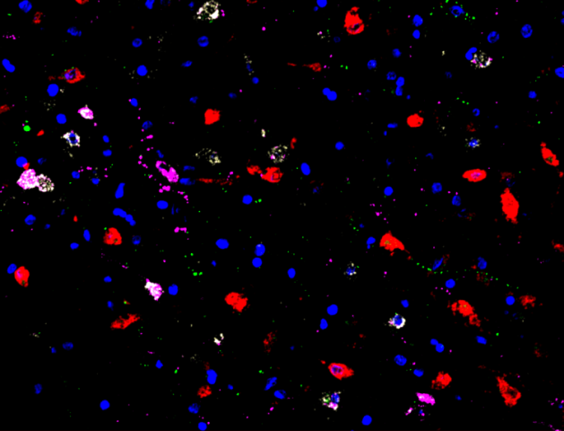This microscopic image of the post-mortem human hypothalamus shows the location of the RNA and protein encoding two key regulators of human appetite namely POMC (protein in magenta and RNA in yellow/white), which suppresses food intake and AGRP (protein in green and RNA in red) which antagonises the action of POMC-derived peptides and stimulates appetite. Cell nuclei are stained blue. (Credit John Tadross, Katherine Ridley and Giles Yeo)