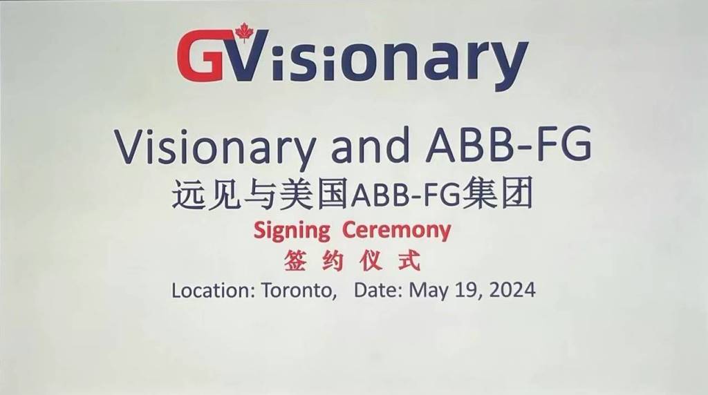 2024 年5月19日下午3点在多伦多远见大厦举办了一次特别意义的签约仪 式,远见控股集团CEO陈忠和美国ABB-FG董事西蒙. 邓签署合作协议,双方 合作将远见位于Moatfield Dr,Toronto,Ontario 95-105#两栋大楼转型升级为“GV 数字科技大厦”。ABB-FG 使用最前沿的数字化技术及专业的证券化法律,将各 类现实世界资产 (RWA), 在最可靠的公链及通证平台支持下,完成美国证监会 Reg.D/S/A+注册登记,指定在全球各大知名的数字资产交易所 (ATS) 进行无间 断的交易。ABB-FG将95-105#数字化和证券化后,在ATS进行全球交易,将 大大提升该物业的价值,同时,对快速提升远见自身的经济增长,实现远见产 业的互联网化、数字化和智能化,降低产业成本、提高用户体验和增加产业收 入也产生巨大的作用,远见也将成为加拿大数字经济的先锋。
