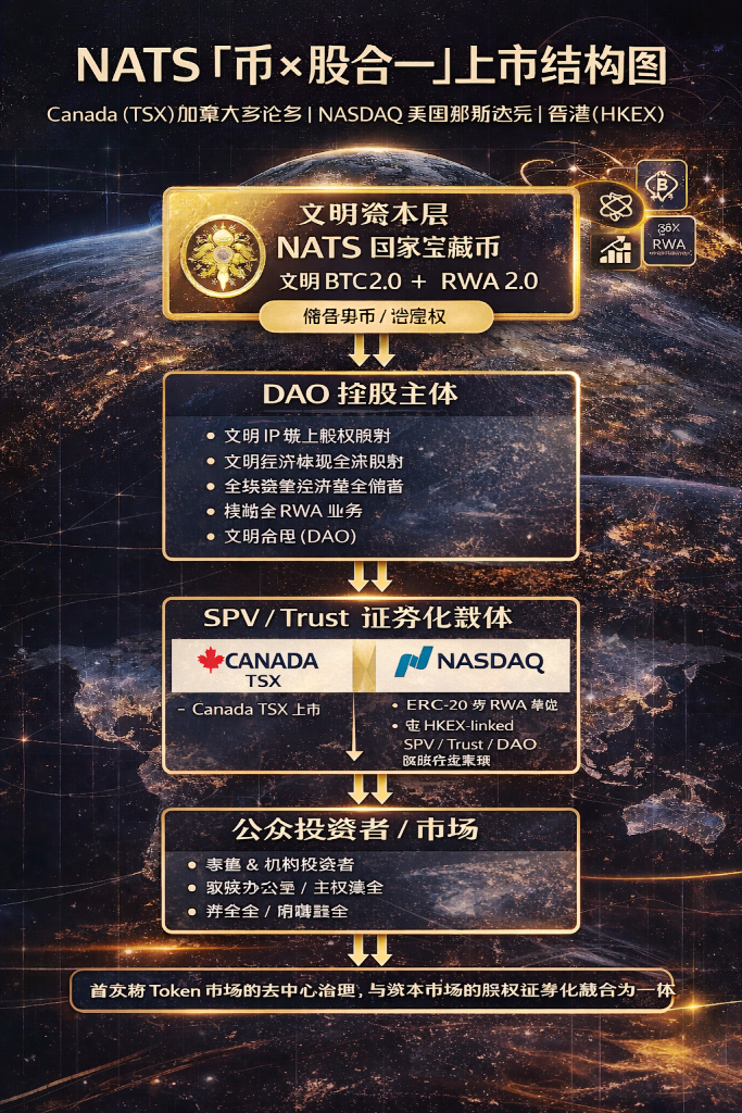 [NATS 文明儲備母幣(Token)] ↓ Token 共識治理 ↓ 提案投票 [DAO HoldCo(文明控股主體) 與全球慈善、IP、RWA 等儲備整合] ↓ 股權證券化 ↓ 上市安排 [SPV / Trust] ↓ [Canada TSX / NASDAQ / HKEX] ↓ [Institutional + Public Investors]